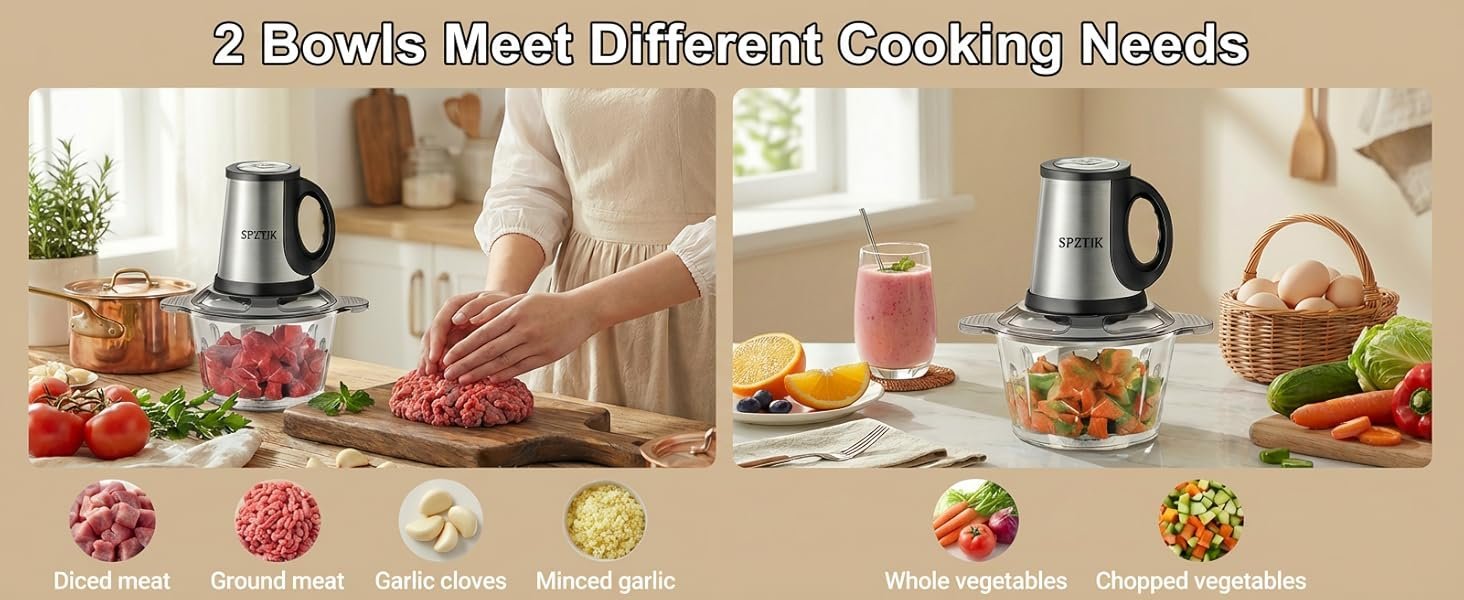 SPZTJK Multifunktionaler Elektrischer Schneidroboter aus, Fleischhacker für den Hausgebrauch, Zerkleinerer Elektrisch,zwei Schüsseln(Edelstahls & Glass)und klingen,zum Zerkleinern und Hacken geeignet, Ideal für Gemüse, Knoblauch, Salat, Babynahrung